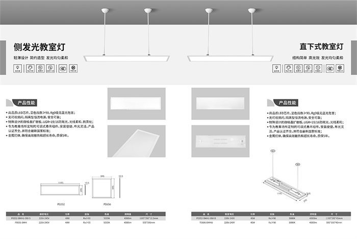 其中,LED UGR教室燈設計輕薄,造型簡約,能夠讓教室煥然一新;LED直下式教室燈采用微棱鏡擴散板,發光均勻柔和;LED格柵教室燈采用格柵面板設計,光線均勻柔和;LED黑板燈采用漫反射型光柵,高光效,低能耗。