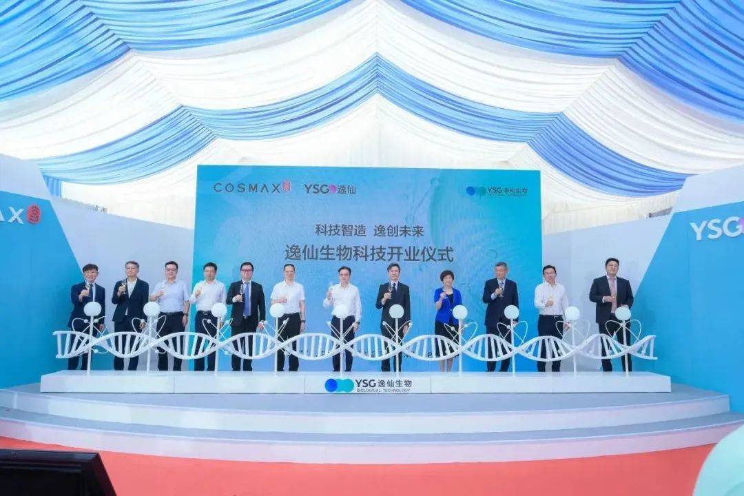 逸仙生物科技總經理李相仁、科絲美詩集團副會長崔京、廣州市工業和信息化局副局長張宏偉、廣州市從化區委副書記、區長趙龍、逸仙電商創始人董事長兼CEO黃錦峰、駐廣州總領事館總領事姜相旭、中國香料香精化妝品工業協會理事長顏江瑛、科絲美詩集團會長李慶秀、科絲美詩集團代表李丙晚等中韓代表共同出席見證,為逸仙生物科技開業揭幕。
