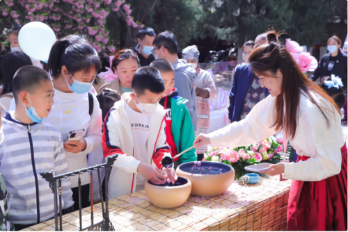 來賓們?cè)谫p櫻的同時(shí)紛紛錄制有聲明信片“我想對(duì)黨說”,體驗(yàn)各式手作、風(fēng)箏制作、DIY團(tuán)扇制作、漢服秀等。“越羅衫袂迎春風(fēng),玉刻麒麟腰帶紅。”春色花下,飄逸的裙裾、精致的簪花,中華傳統(tǒng)服飾之美與絢爛多姿的國潮風(fēng)交相輝映,在水墨香中感受漢字書法的魅力所在,在詩詞之美中,領(lǐng)略詩意人生的寫照、家國情懷的寄托,傳承詩詞文化,涵養(yǎng)民族精神。