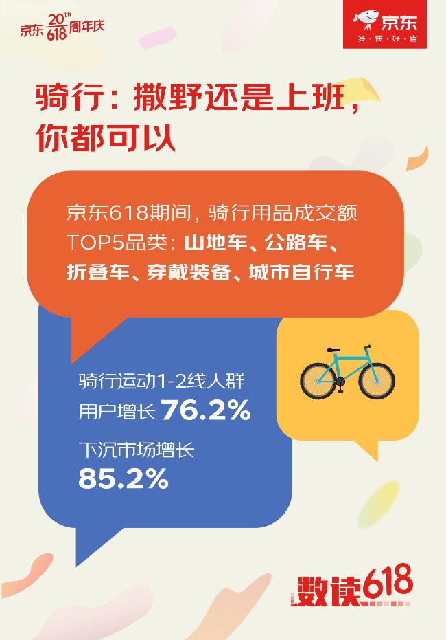 京東騎行數據顯示,騎行在今年應該可以拿下增速最高的戶外類目頭牌。其中分(專業、非專業、泛潮)公路車、山地車、青少年自行車、電助力車、城市通勤自行車等,品類十分豐富,能很好地滿足騎行達人們的“步履不停”的酷炫運動生活。