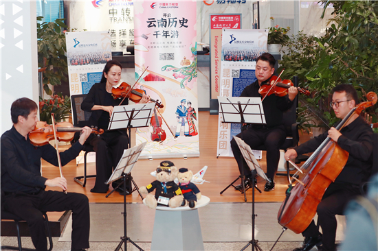 值得一提的是,中國唯一一支以人民音樂家“聶耳”命名的交響樂團——昆明聶耳交響樂團,在主題航班首航儀式活動現場,用專業、優雅的演奏,帶領旅客走進云南,靈動的音符、悅耳的曲調贏得了旅客的稱贊與掌聲。