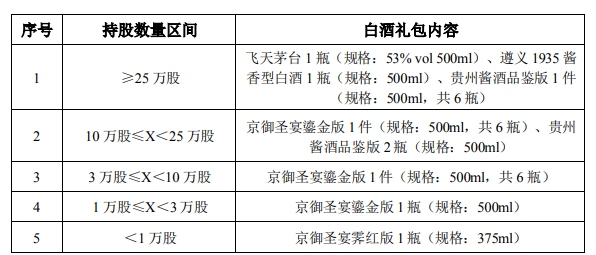 根據活動安排,吉宏股份持股25萬股以上的股東收到的白酒禮包將包括:飛天茅臺1瓶(規格:53%?vol?500ml)、遵義1935醬香型白酒1瓶(規格:500ml)、貴州醬酒品鑒版1件(規格:500ml,共6瓶)。
