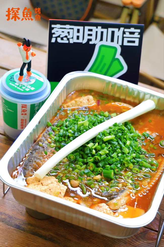 在產品研發上,探魚也充分考慮了顧客在感官、味覺、互動等多方面的場景體驗,最新推出的“鮮青椒蔥蔥烤魚”就充分體現了這一點。鮮青椒蔥蔥烤魚在創新理念上,是探魚招牌口味“鮮青椒爽麻烤魚”口味的味型升級,在藤椒口味的基礎上增加時令性的蔥香風味,一經推出,就頗受大眾喜愛。據悉,新品上市7天,已經比去年同期上新的烤魚銷量上漲105%。在產品呈現上,新品上餐時配上一整棵鮮甜大蔥,然后由服務人員現場進行“剪蔥儀式”,將蔥段下入鍋內,提味增香,同時為消費者營造一種新奇特的體驗感。除此之外,探魚借勢本次上新,與最近大熱的植物品牌“超級植物公司”聯名推出可以種出小蔥的“蔥明種子卡”,不僅深化蔥的產品主題,還收獲了目標客群“打工人”的情感共鳴。