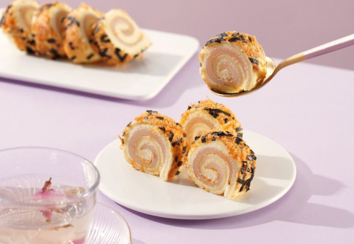 盼盼肉松海苔戚風卷,不愧是盼盼食品深耕烘焙產品的又一力作!外面滿滿的一層肉松與海苔,這絕妙搭配,讓整塊蛋糕卷的風味更上一個臺階!恰到好處的咸香口味,中和了甜點本會有的甜膩。第一眼看到松軟又帶有淡淡油潤的肉松上鋪著微脆的小片海苔,松軟鮮香,好吃又不膩,讓人忍不住深入挖掘,一探究竟!