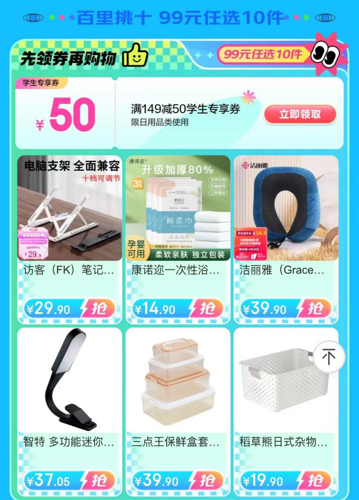 為了讓學(xué)生們省錢(qián)煥新,京東開(kāi)學(xué)季特設(shè)“百里挑十 ”專區(qū),雜物收納籃、筆記本電腦支架、泡腳盆、毛巾、水果刀、除螨噴霧等剛需好物99元任選10件,更有搬家打包收納袋、真空壓縮包、抽屜式桌面收納盒、衣服收納筐等海量商品享低至5折的學(xué)生折扣,為學(xué)生們帶來(lái)超值優(yōu)惠。