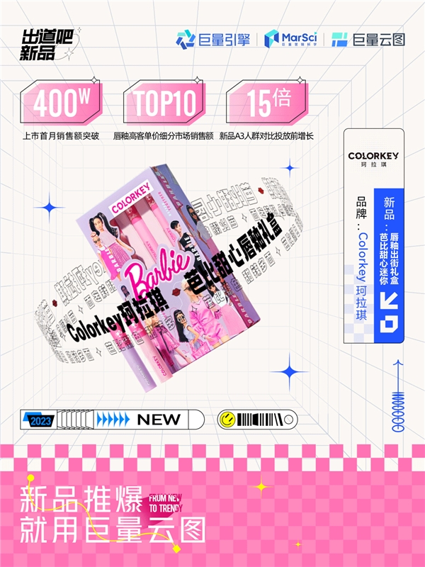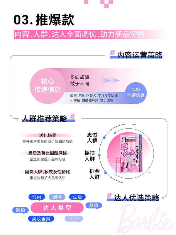 適用于送禮、提升品牌調性、具有高客單價特征的“芭比禮盒”新品,符合品牌風格特點和消費需求,適宜作為品牌形象款進行主推和破圈?;诖?珂拉琪打造高客單價“芭比甜心迷你唇釉出街禮盒”作為618活動的主推新品,強力吸引目標人群。