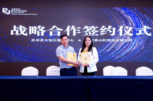 活動現場,北京北大寶石鑒定中心與北京真心紅珠寶有限公司還舉辦了現場簽約儀式,雙方將在珠寶鑒定、數字化溯源以及從業人員專業培訓等多個版塊開展豐富的合作。