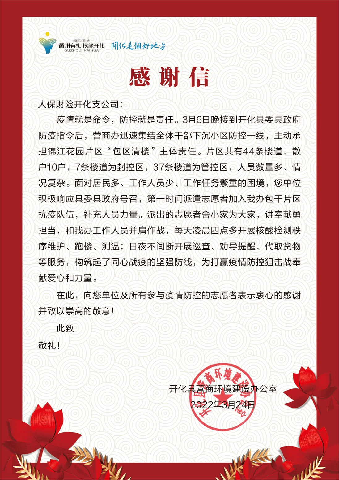 開化縣營商環(huán)境建設(shè)辦公室為開化人保財(cái)險支持抗疫送上的感謝信。