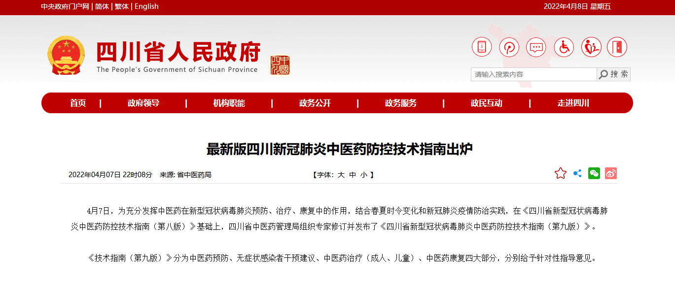 為充分發揮中醫藥在新型冠狀病毒肺炎預防、治療、康復中的作用,結合春夏時令變化和新冠肺炎疫情防治實踐。4月7日,四川省中醫藥管理局在《四川省新型冠狀病毒肺炎中醫藥防控技術指南(第八版)》基礎上,修訂并發布《四川省新型冠狀病毒肺炎中醫藥防控技術指南(第九版)》。其中,連花清瘟顆粒(膠囊)被推薦用于臨床治療期外感風熱證和風熱夾濕證的治療。連花清咳片被推薦用于醫學觀察期咽干、咽痛、咳嗽,或伴發熱等癥狀的治療。