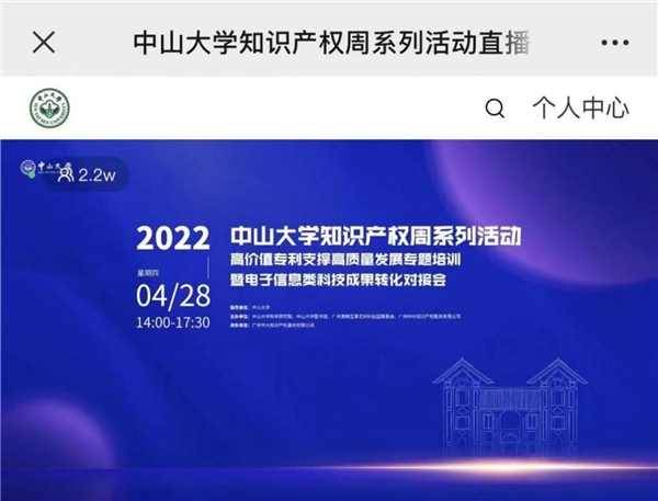 2022年4月28日,在中山大學的全程指導及越秀區政府的鼎力支持下,中山大學科學研究院、廣州高新區黃花崗科技園管委會、中山大學圖書館、廣州中大知識產權服務有限公司共同成功主辦中山大學知識產權周系列活動高價值專利支撐高質量發展專題培訓暨電子信息類科技成果轉化對接會。本次活動采取線上方式開展,邀請兩位業界專家圍繞高價值專利支撐高質量發展做專題報告,多達178項電子信息類專利項目與83家企業進行了精準對接,活動在線人數超2.2萬人,多位知識產權專家及知名企業在云端匯聚,助力知識產權高質量發展。