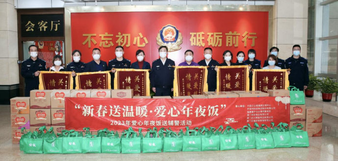 由中國企業報福建公司發起的“2023愛心年夜飯送輔警活動”第三個中國人民警察節當天在廈門市公安局大院隆重舉行,來自羅普特科技集團股份有限公司、福建重宇合眾律師事務所、廈門綠進食品有限公司、廈門達川臻富食品有限公司、廈門見福連鎖管理有限公司等愛心企業為廈門輔警支隊一線輔警送來了節日的問候和預制菜、油、果汁等愛心年夜飯“大禮包”,以及口罩等防疫物資,向奮斗在在一線守護廈門城市平安的執勤輔警表示感激和敬意。