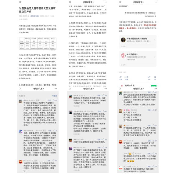 時隔5天后,錦上添花集團首次回應。3月21日,公眾號“老劉講文旅”(tsxz10000,認證信息為西安錦上添花裝飾設計工程有限公司小寨分公司)作為回應,發布了對西安曲江大唐不夜城文旅發展有限公司的聲明,以及對某市快報、陜某新聞、某端新聞報道、自媒體某京筆記造謠的聲明(詳見下圖):