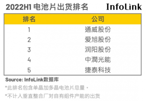 據PVInfoLink統計,今年上半年晶硅電池總產量約135.5GW。TOP5的通威股份、愛旭股份、潤陽股份、中潤光能、捷泰科技,總出貨量約59GW,占43.54%。另有投研機構統計,TOP5出貨中,通威出貨約為22.5GW、愛旭出貨約為17GW、潤陽出貨約為13GW、中宇出貨約為5GW,捷泰出貨約為3GW。