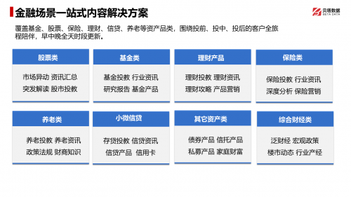 貝塔數(shù)據(jù)針對(duì)金融場(chǎng)景提供了一站式的內(nèi)容解決方案,覆蓋基金、股票、保險(xiǎn)、理財(cái)、信貸、養(yǎng)老等不同資產(chǎn)類別,并以投前、投中、投后的全過(guò)程為核心,為金融機(jī)構(gòu)提供全面的客戶陪伴服務(wù)。